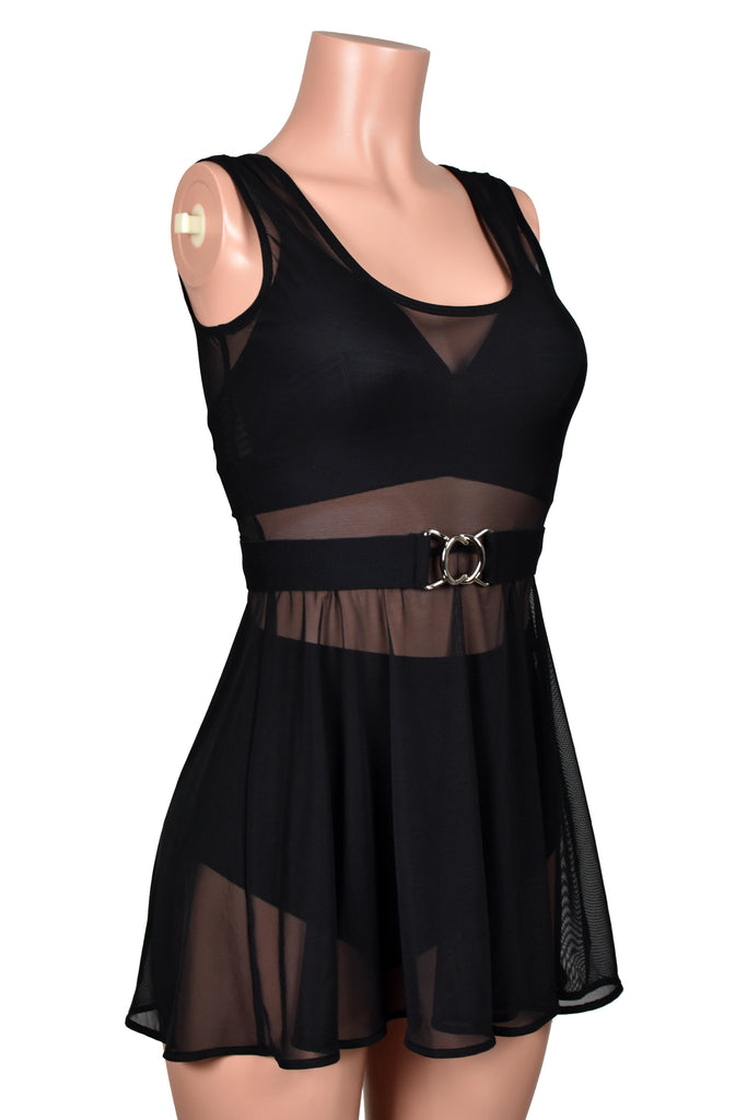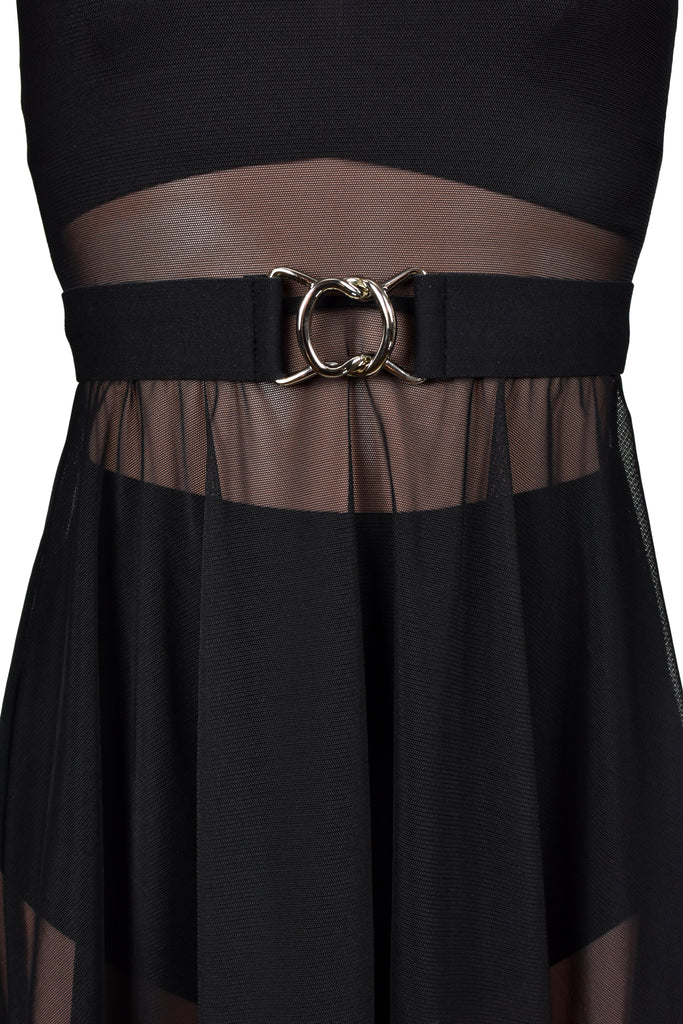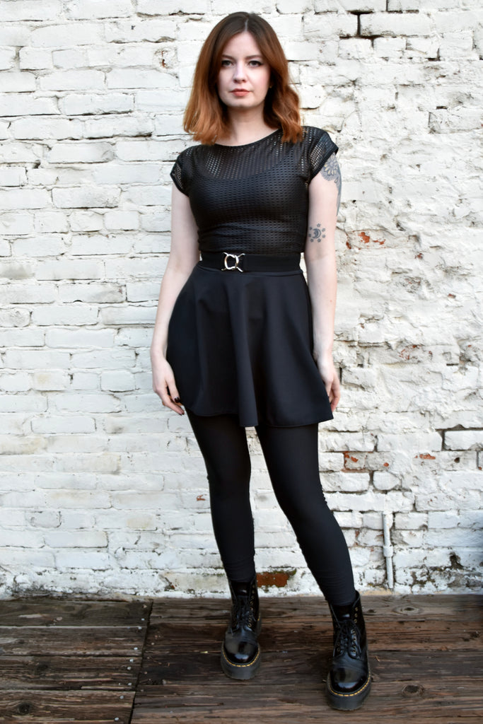 Add a defined waistline to your outfit with this stretchy elastic belt. The elastic is matte black, red, or white with a smooth texture and the buckle is shiny silver metal. In the photos it was worn over a Black Mesh Mini Skater Dress (sold separately).