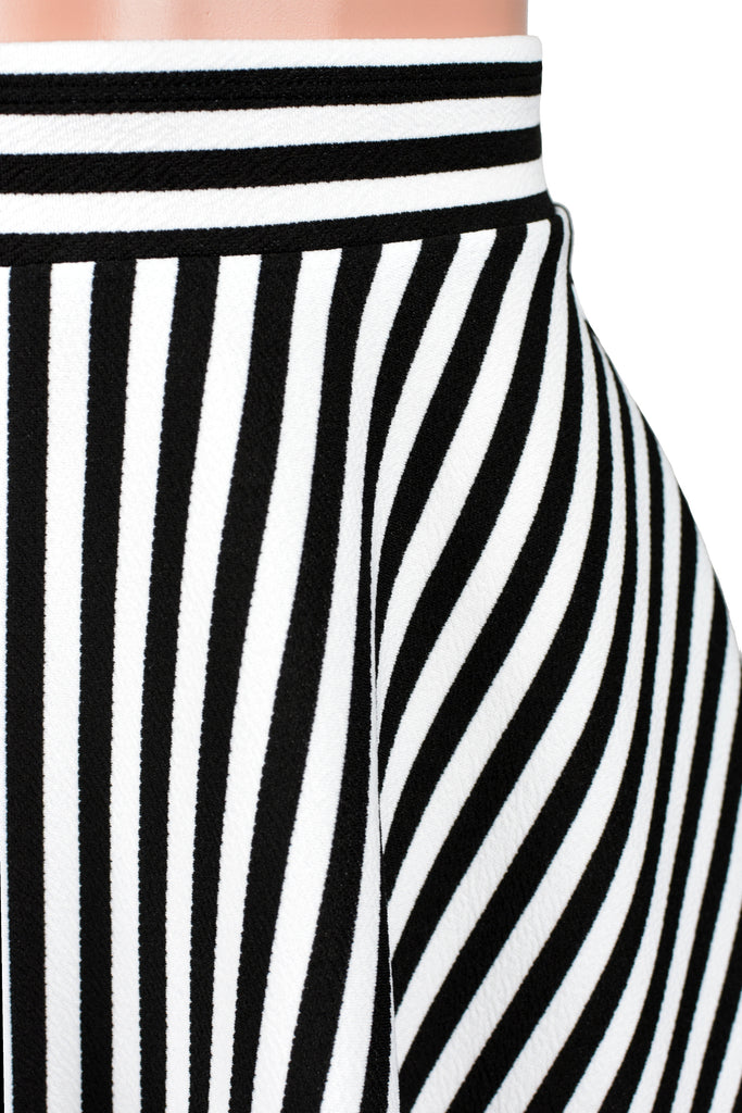 This high-waisted black and white striped skater skirt is made out of a stretchy textured mediumweight knit fabric. The stripes are a little over 1/4 inch wide. The skirt is pull-on and the waistband has a narrow band of elastic sewn inside the top.