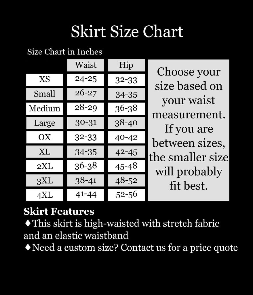 ■SIZE INFO: Find the size chart in the item images. Choose your size based on your waist measurement. This skirt is high-waisted with stretch fabric and an elastic waistband. Size chart shows body measurements, not skirt measurements. The actual skirt waistband will be slightly smaller than your waist and stretch to fit.