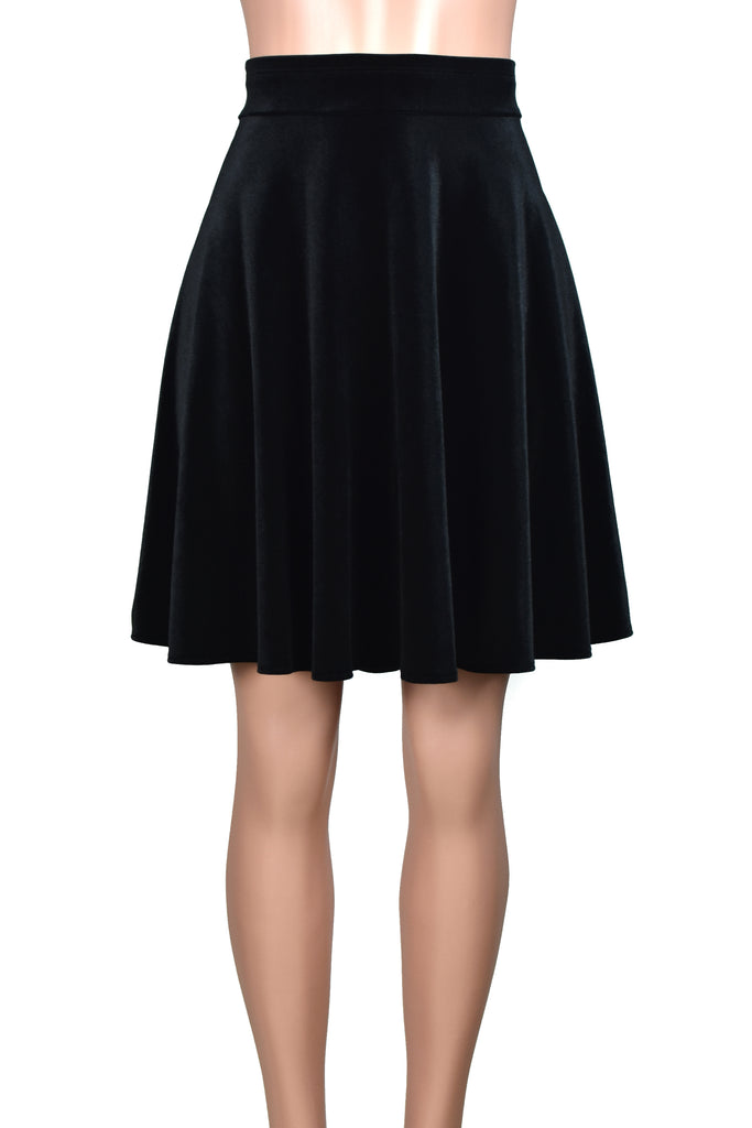 This knee length swing skirt is made out of black stretch velvet fabric. It is fitted at the waist and flared at the hem.