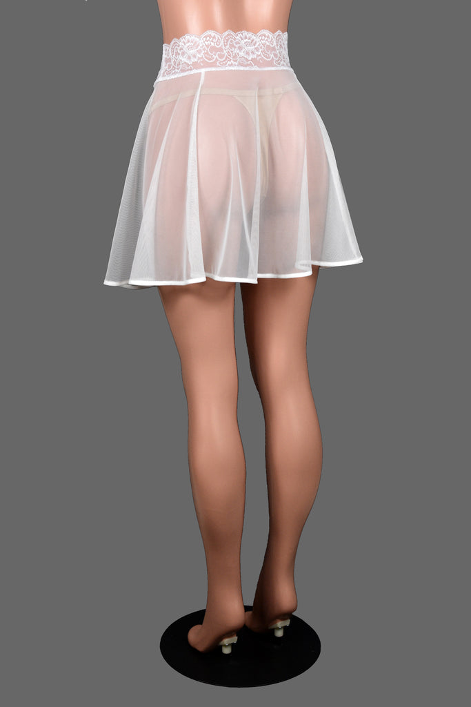 This sheer lingerie skirt is made out of stretchy white mesh fabric with a scalloped stretch lace waistband.
