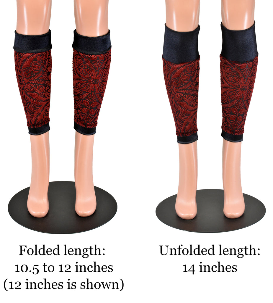 These semi-sheer leg warmers are made out of red and black stretch burnout velvet fabric that has a brocade pattern. They have wide satin trim around the top and ankle. The satin trim around the top can be folded down to adjust the length. Choose your size based on the leggings size you normally wear. (see below for more sizing info)